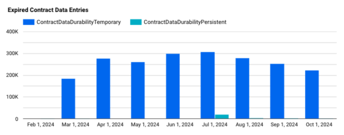 As you can see, persistent contract data entries account for roughly 25% of all contract data entries with the rest being temporary. There are also a lot more expired temporary contract data entries. This is expected because temporay entries cannot be bumped whereas persistent entries can be bumped/restored. For more information, you can read about State Archival and the Contract Data Lifecycle.